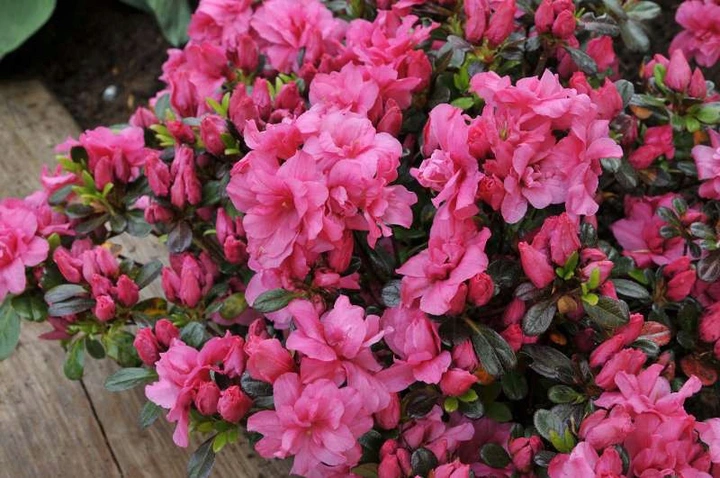 Саженцы Азалии японской Рококо (Azalea japonica rokoko) станут ярким экзотическим украшением любого интерьера. Сорт чаще используется для выращивания в горшках, но в теплое время года отлично чувствует себя в саду или в парке. Взрослое растение редко превышает 50 см в высоту, его крона очень густая и плотная. Цветение азалии начинается в мае и продолжается 2—3 недели. В это время куст покрывается мелкими цветами (до 3 см в диаметре) малиново-красного оттенка. Они собраны в соцветия по 10 штук, под ними практически не видно побегов и листьев. Еще одна особенность сорта — насыщенный цветочный аромат.