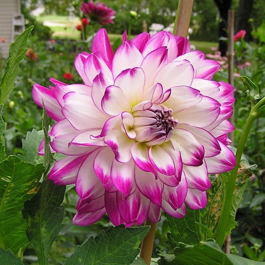 Луковицы георгины Ху Ми (Dahlia Who Me) нравятся садоводам очень нежным цветением. Они не требуют сложного ухода, зато радуют глаз с начала лета до осени. Кусты высокие, крепкие, с множеством ответвлений, в высоту достигают примерно 1 метр. Бутоны очень эффектной окраски: почти белоснежные лепестки по краям становятся ярко-лиловыми, что создает эффект контрастности и перламутра. Серединка темная, лиловая или бардовая. Сам бутон очень крупный, хорошо заметный издали. Цветы не требуют сложного ухода. Они быстро растут на плодородных, легких почвах в солнечных местах посадки.