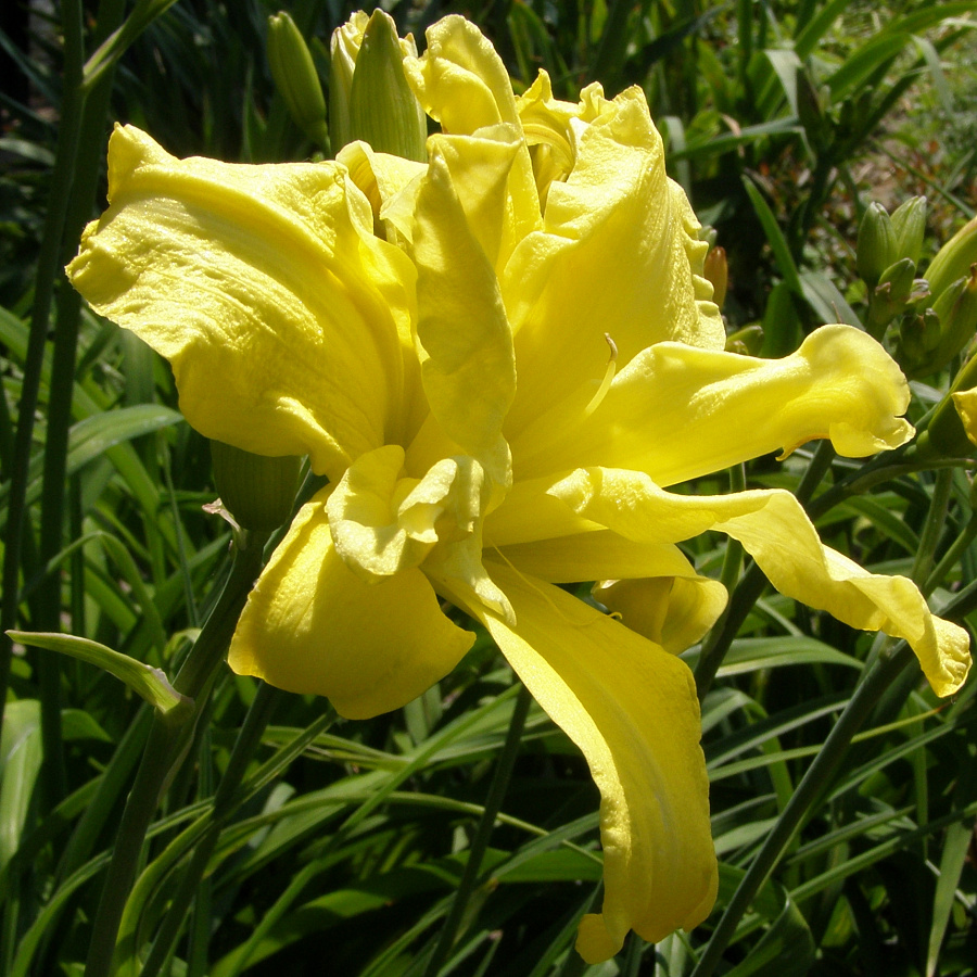 Рассада лилейника Дабл Ривэ Вай (Double River Wye) удивительный сорт, для которого характерно обильное цветение. В этот период на нем формируются махровые цветки лимонно-желтого оттенка. Растение относится к разновидностям дневного типа цветения. Бутоны на нем распускаются в конце июля и радуют взор окружающих в течение 2 месяцев своими нежными яркими цветками. В диаметре их размер составляет 13 см. Лилейник способен хорошо зимовать независимо от региона. Для укрытия используется невысокий слой мульчирования. Остальную защиту корням и стеблям предоставляет снежный покров.