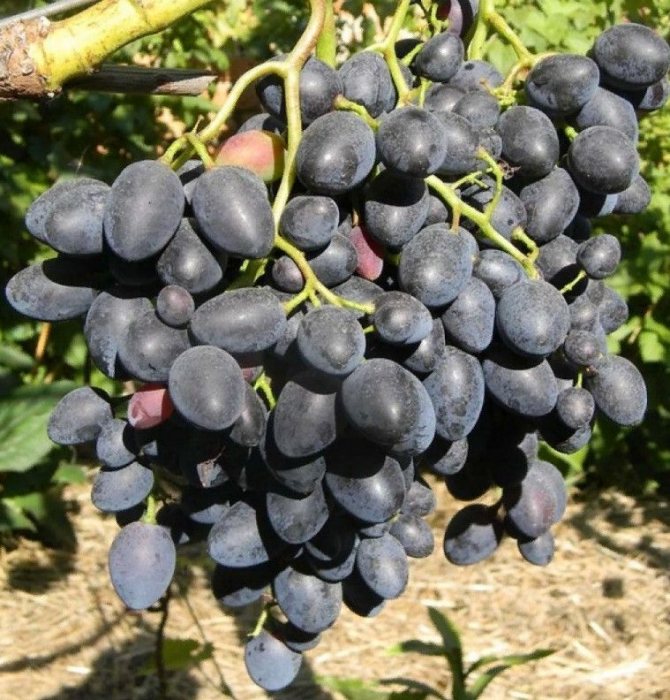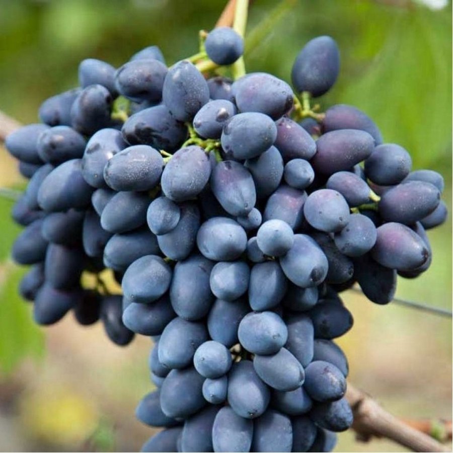 Ягоды могут долго храниться и отлично транспортируются. Они овально-удлиненной формы и синеватого оттенка. Весьма приятные на вкус. Однако есть у этого сорта и недостатки. Например, склонность ягод к горошению, неважная опыляемость при плохой погоде. Кроме того, черенки крупномеров Винограда плодового Надежда АЗОС могут плохо поддаваться укоренению.